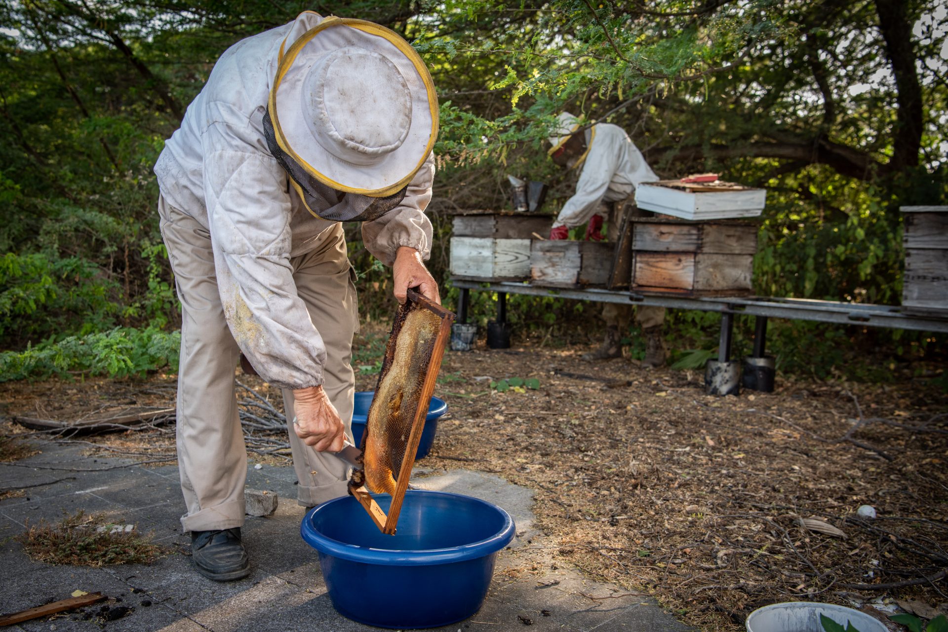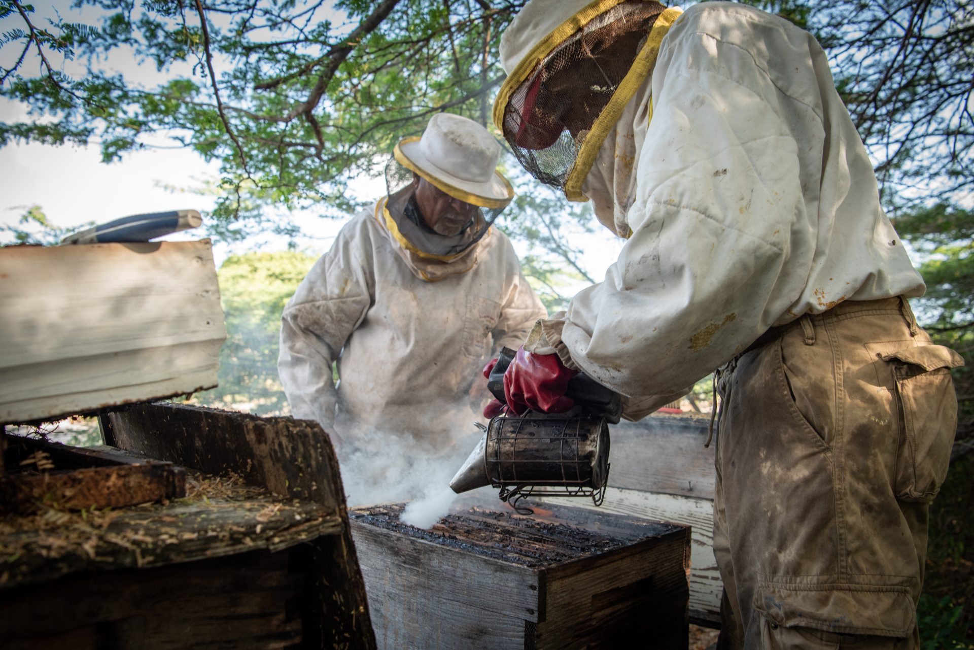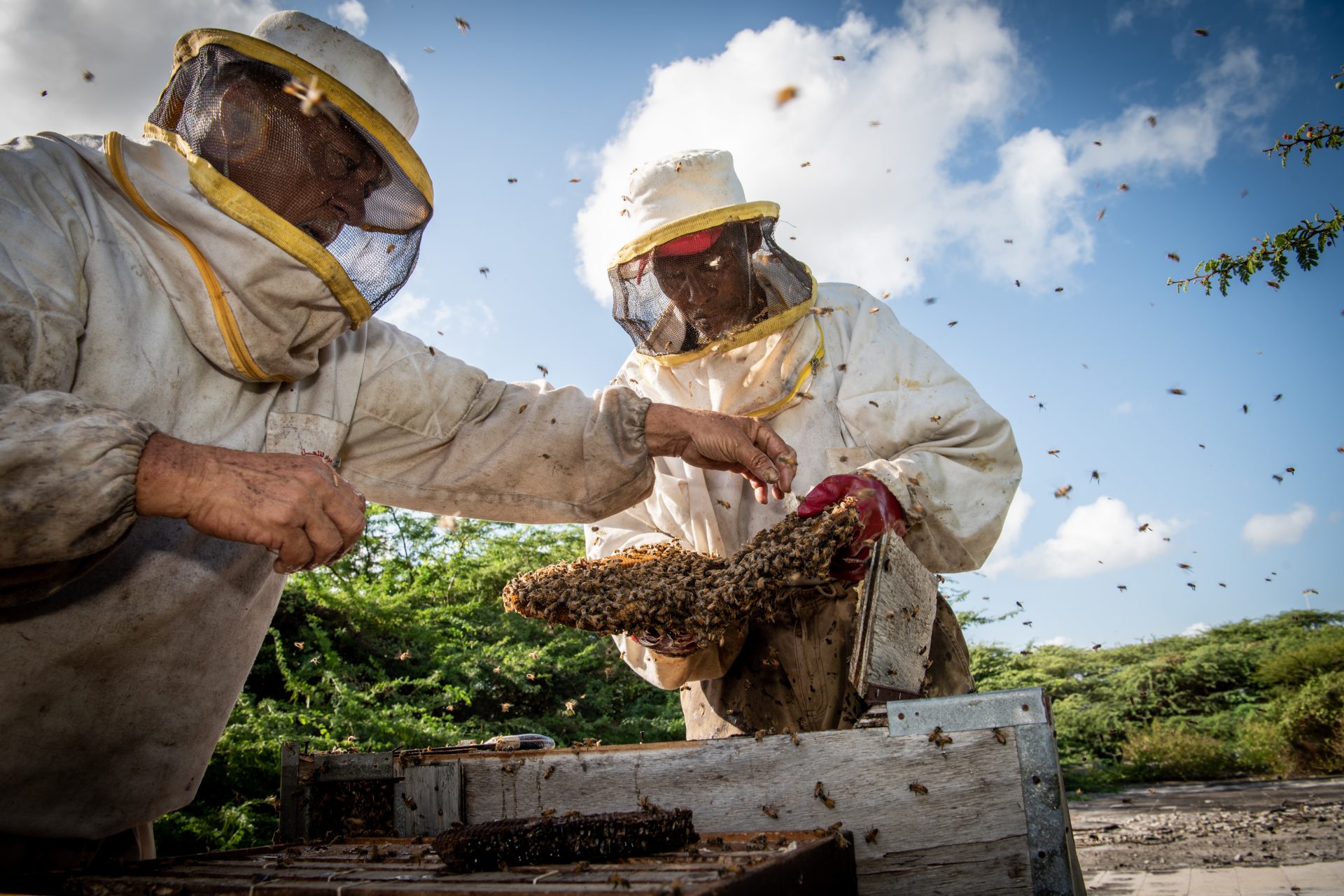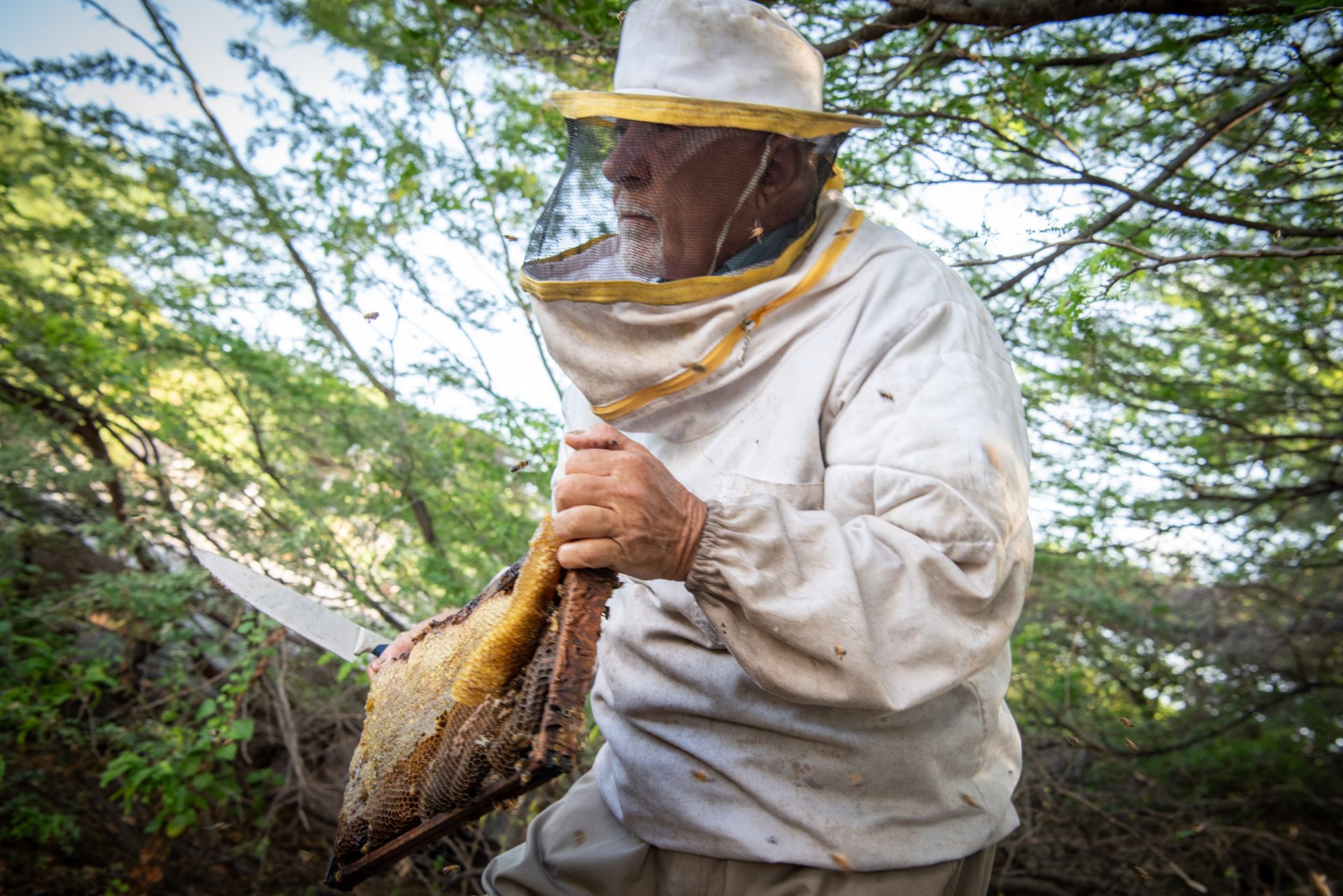 Ayoubi feels, without opening a hive, if there is sufficient honey in it. Only when most of the cells in the combs are neatly sealed it is time to harvest. This happens several times a year and more often in the rainy season, so from November to February. Ayoubi and his co-worker wear a special beekeeper’s suit and use smoke to keep the bees quiet, just to be on the safe side. The bees are not always happy with unexpected visitors and can be a bit irritable.