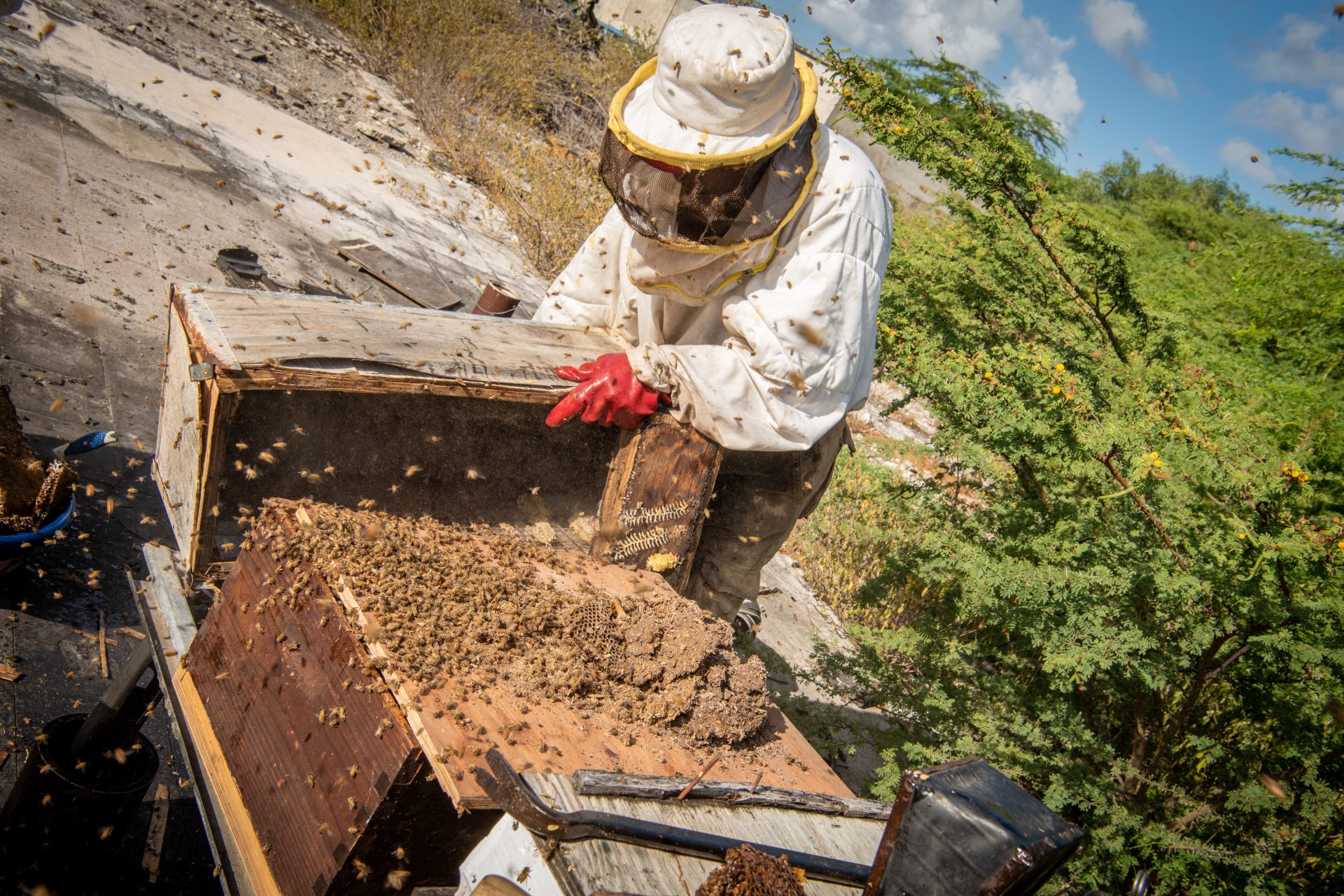 “We remove the nest, take the whole bee colony and put it in a hive. We keep the bee population quiet with cardboard and tobacco smoke from a stainless steel can. The bees feel threatened and suck themselves full of honey. Carrying their precious load, they are less aggressive. A bee that stings will die afterwards. I don’t want to kill the bees, but sometimes there is no other way. For example, if the nest is somewhere in the pipes on the refinery site you can’t use smoke. Then I just plug up the hole. Bees often nest in the speakers of a sound system. Then I take the whole speaker with bee population here, in Suffisant, where all my hives are. I then let the hive settle down first.”