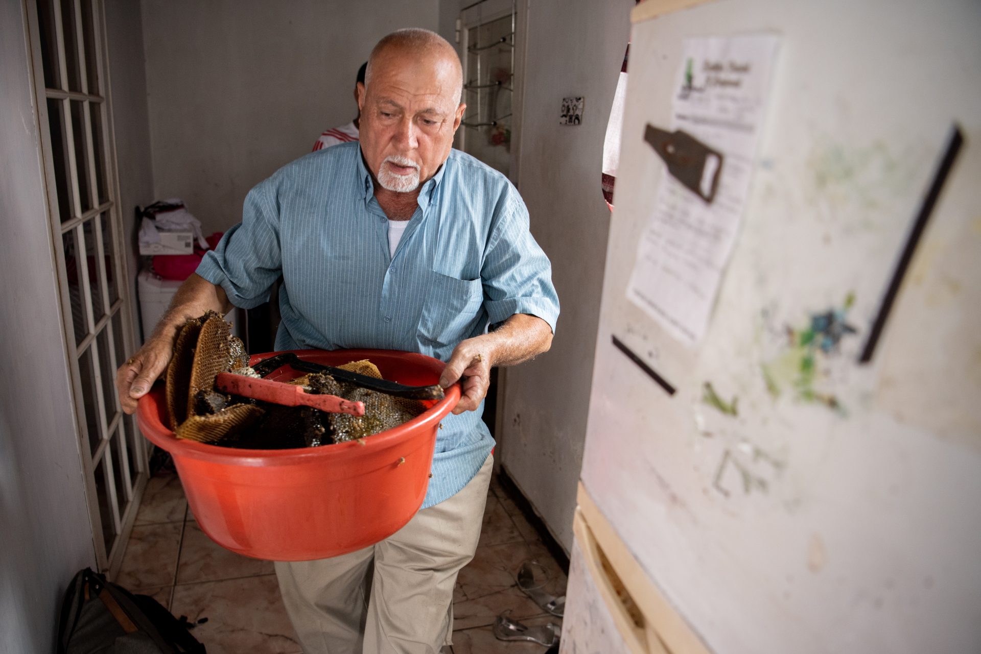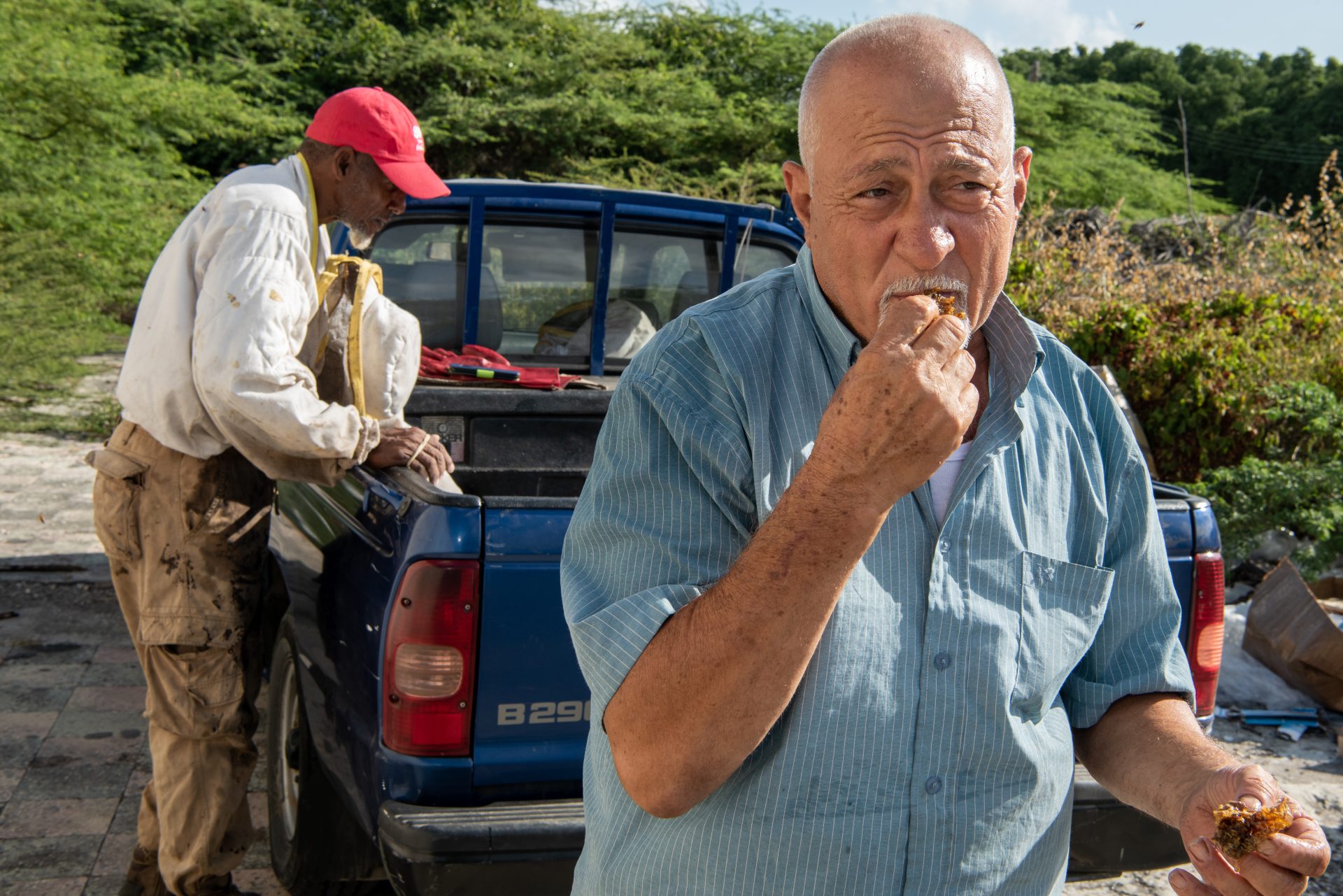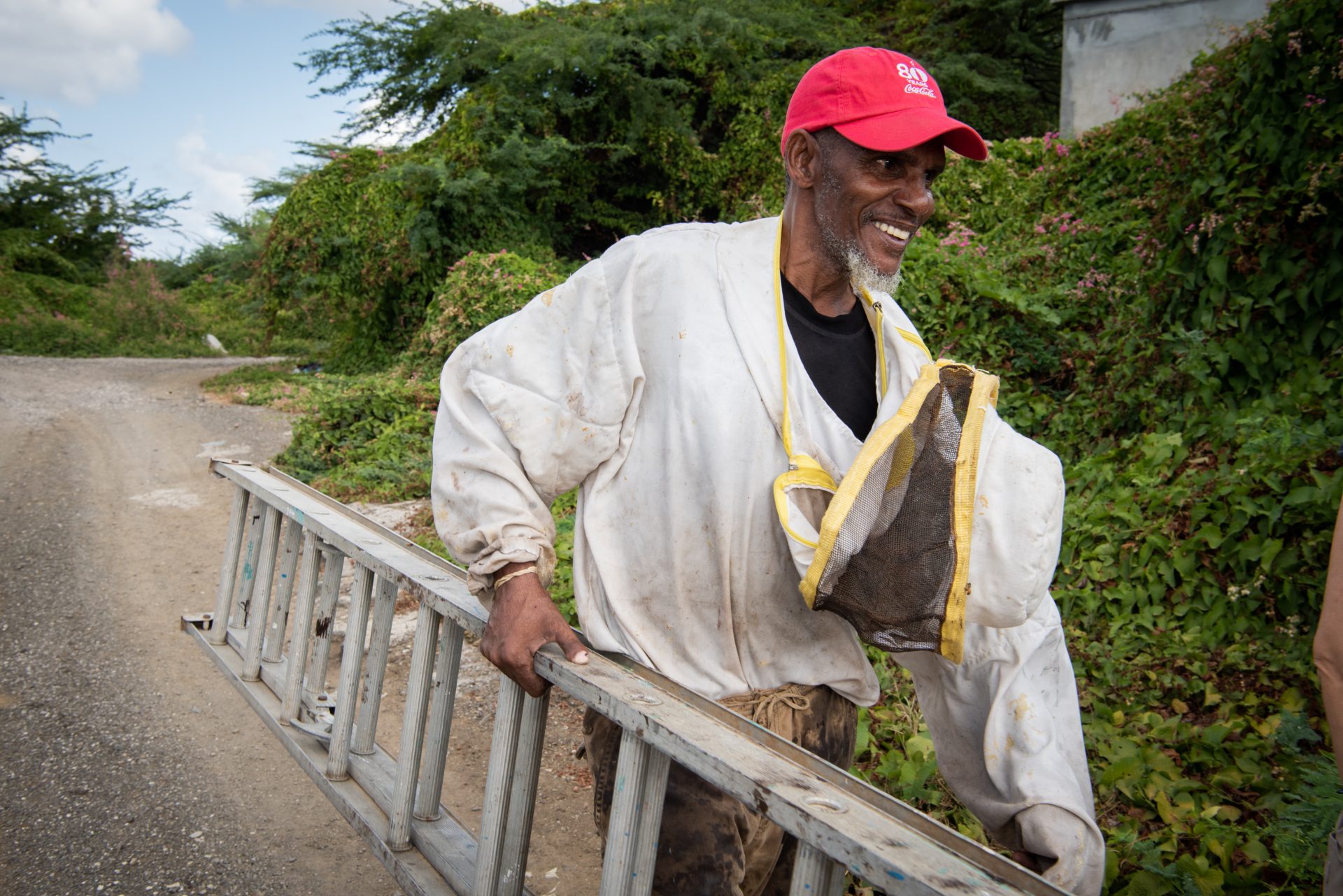 “I‘m 71 years old now and I still collect bees’ nests, sometimes eight to nine in one day. At people’s homes, at businesses, in nature. You will find nests in the strangest places, and they can cause quite a bit of nuisance. On the ceiling of the bathroom, for example. Four years ago, I climbed fifty meters high on one of the chimneys of the refinery. When the bees’ nest is at these extreme heights, we usually use a truck with an aerial work platform. The police, the government, Aqualectra, they all have my name and number and call me whenever there is a nuisance.”