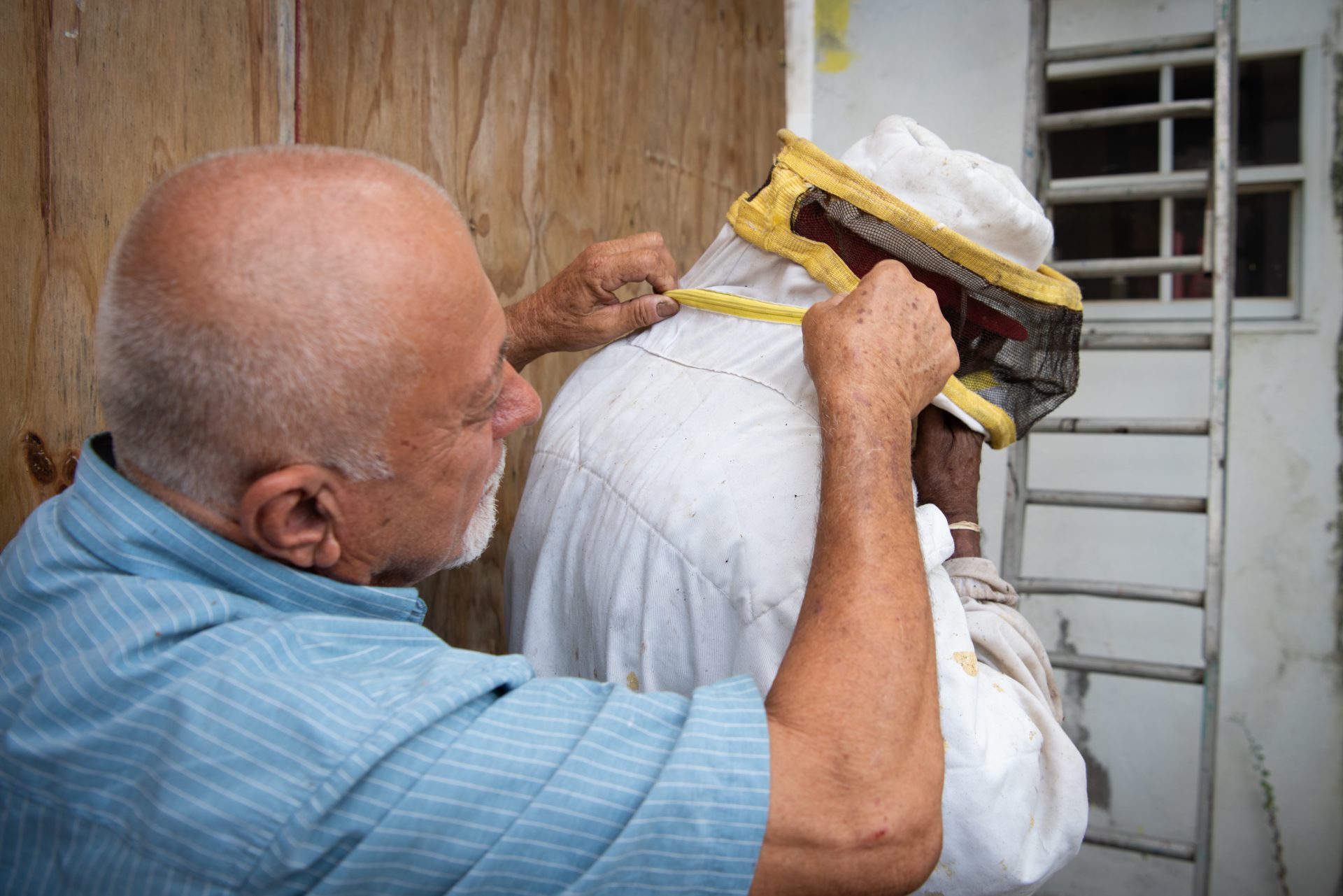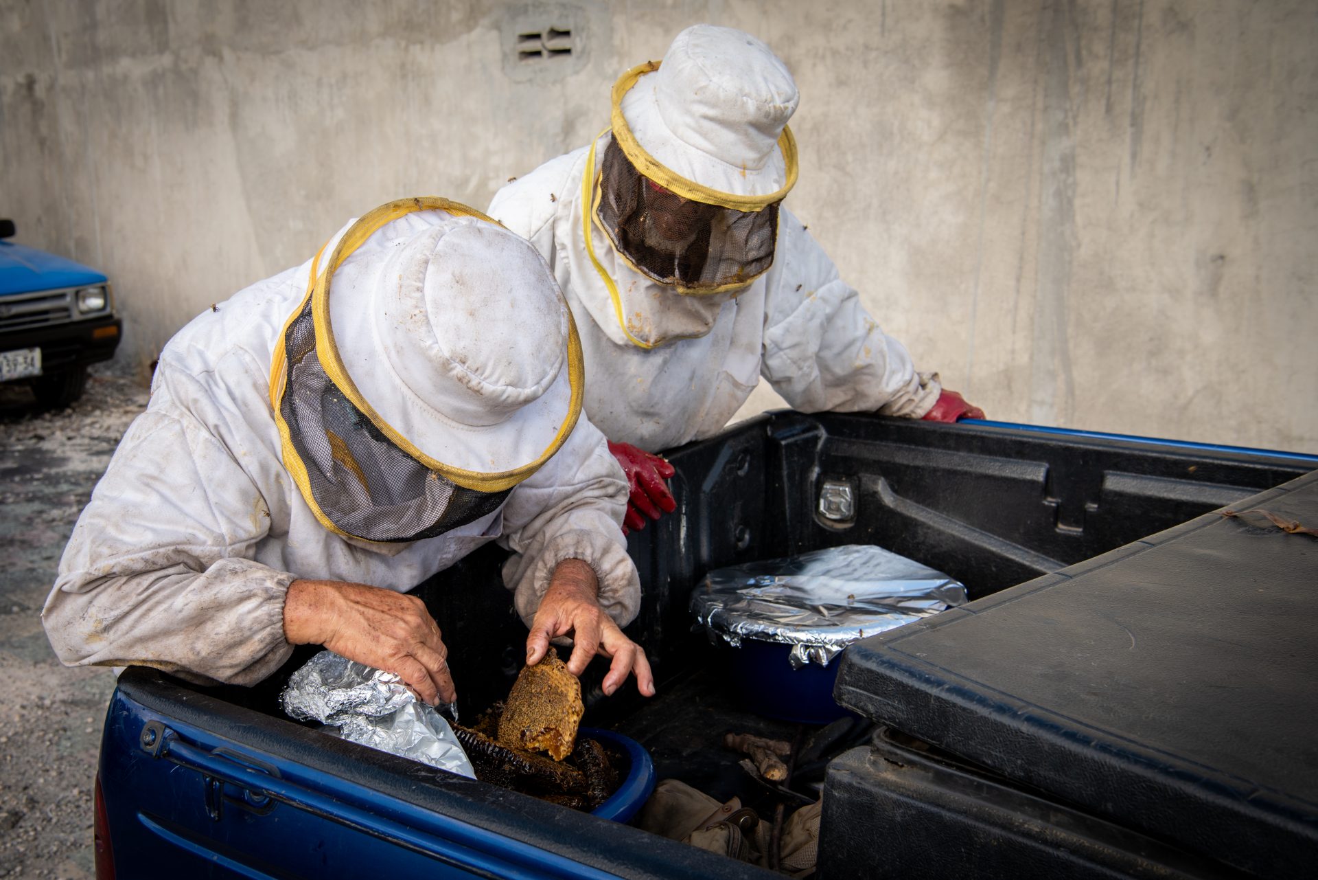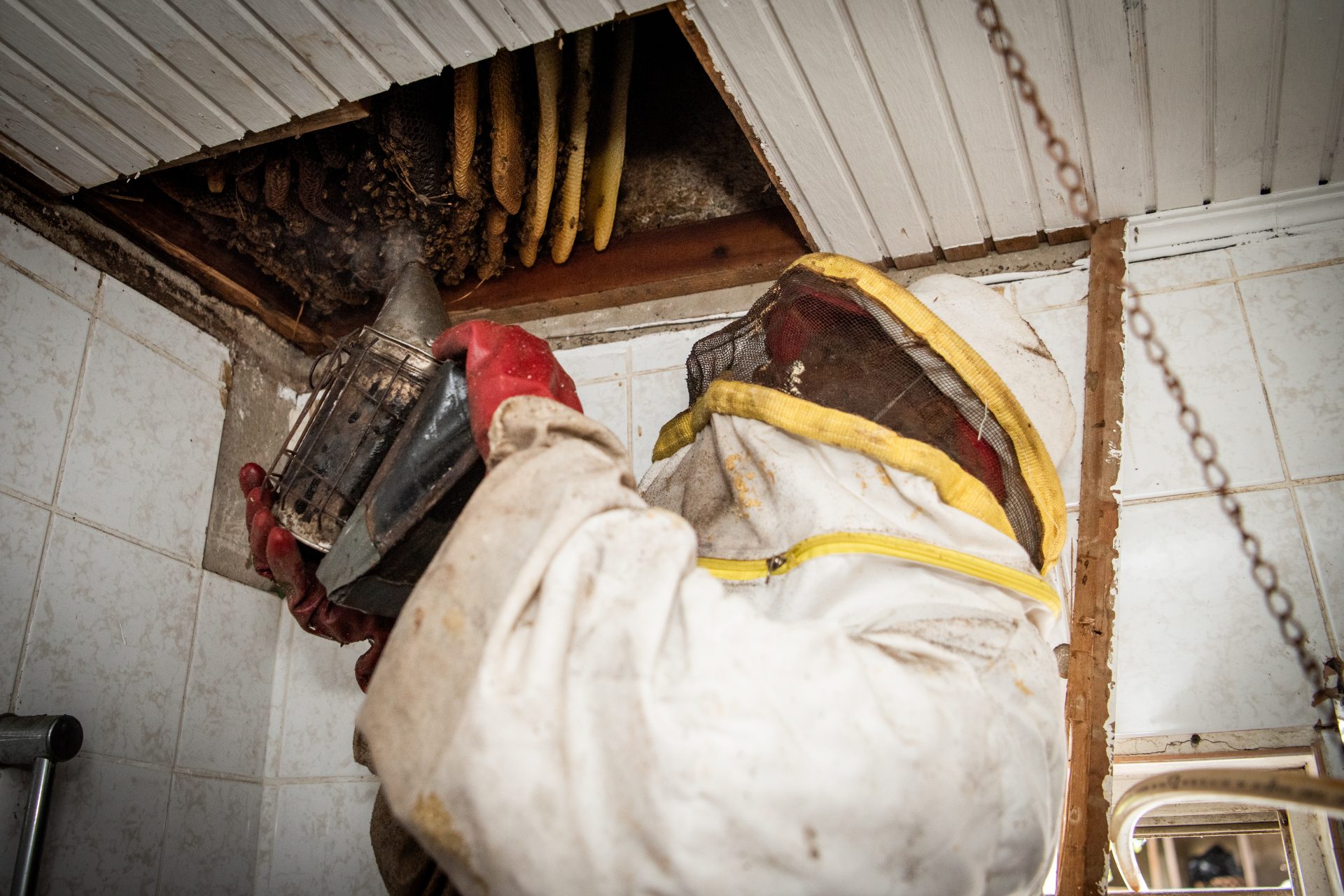 “I‘m 71 years old now and I still collect bees’ nests, sometimes eight to nine in one day. At people’s homes, at businesses, in nature. You will find nests in the strangest places, and they can cause quite a bit of nuisance. On the ceiling of the bathroom, for example. Four years ago, I climbed fifty meters high on one of the chimneys of the refinery. When the bees’ nest is at these extreme heights, we usually use a truck with an aerial work platform. The police, the government, Aqualectra, they all have my name and number and call me whenever there is a nuisance.”