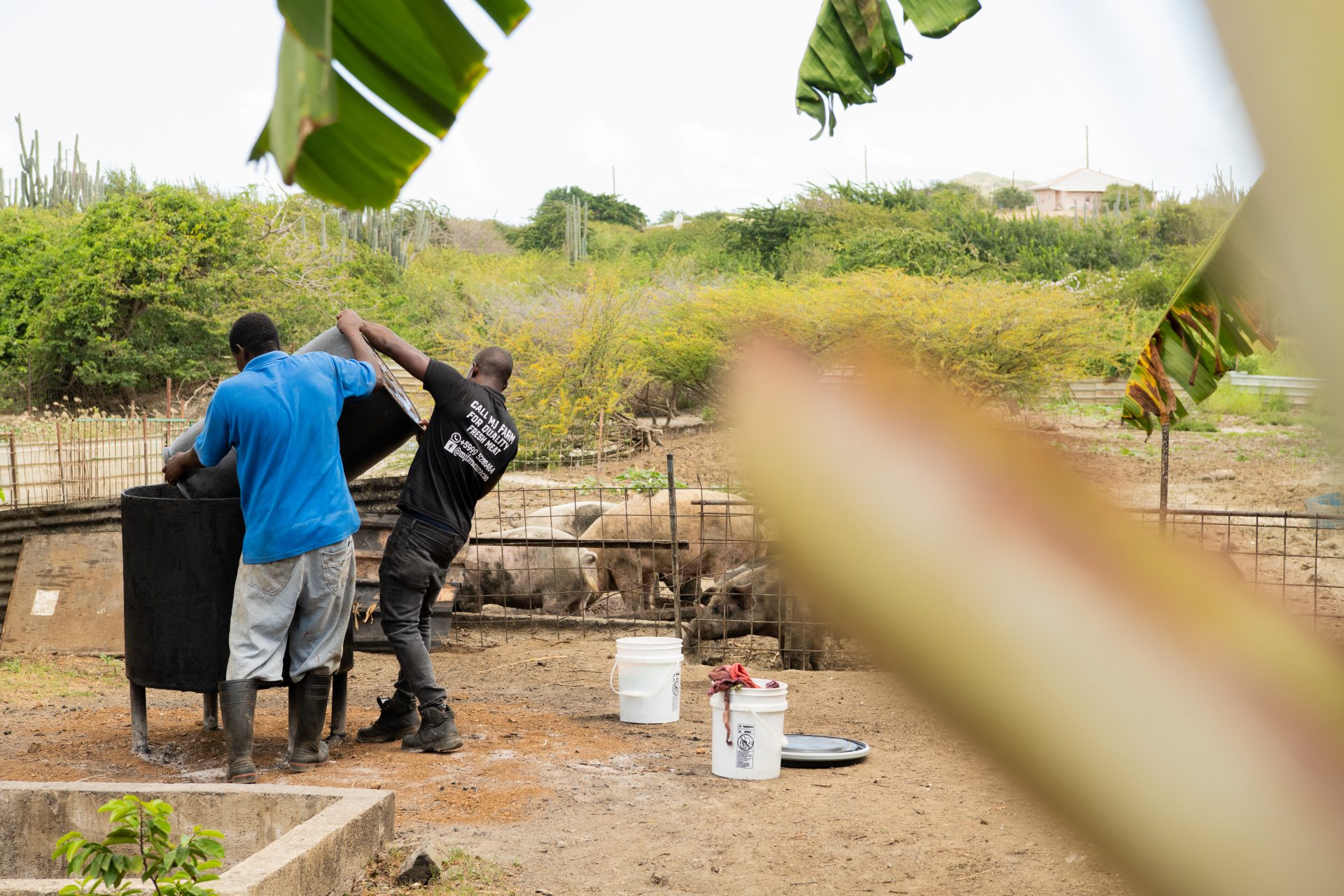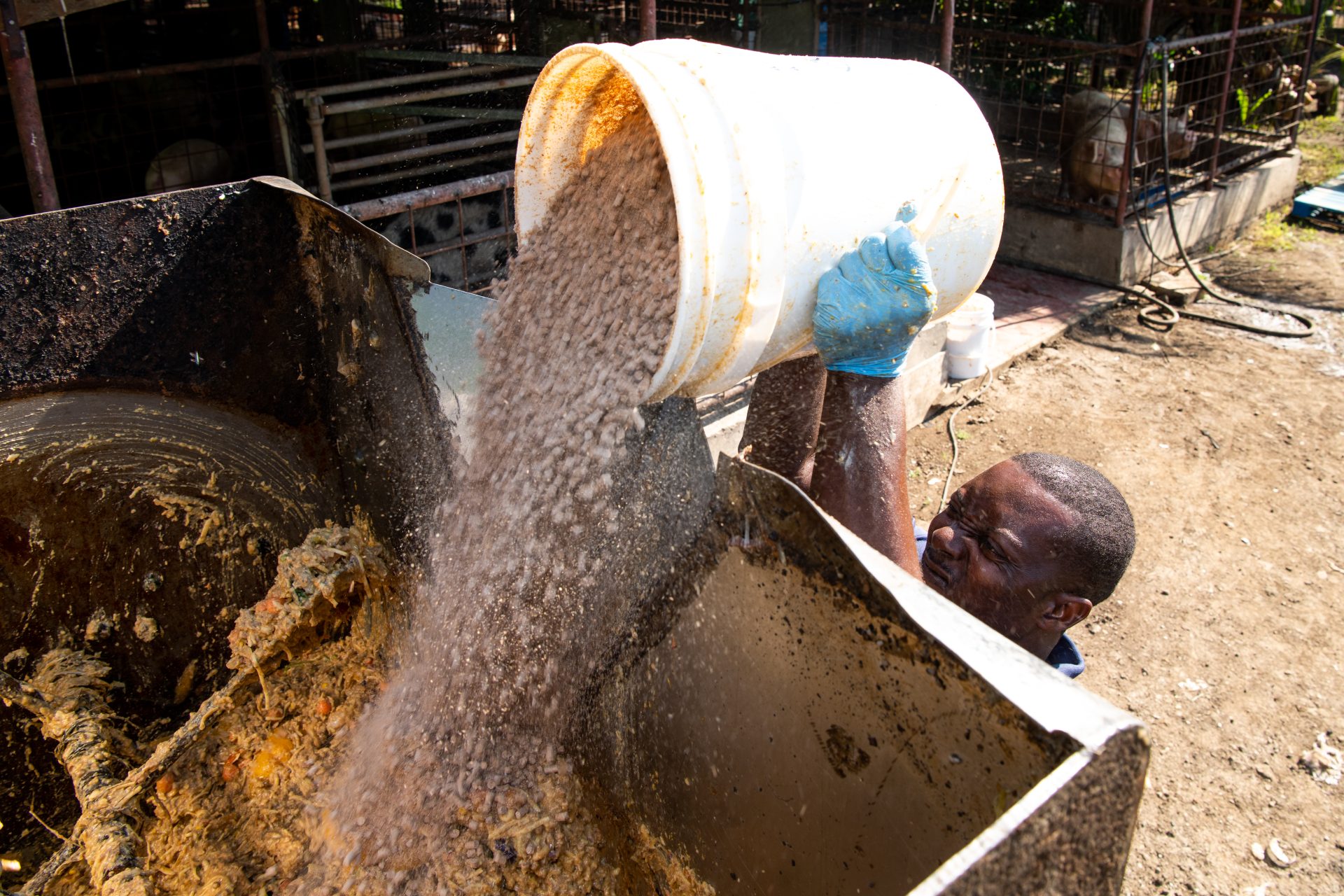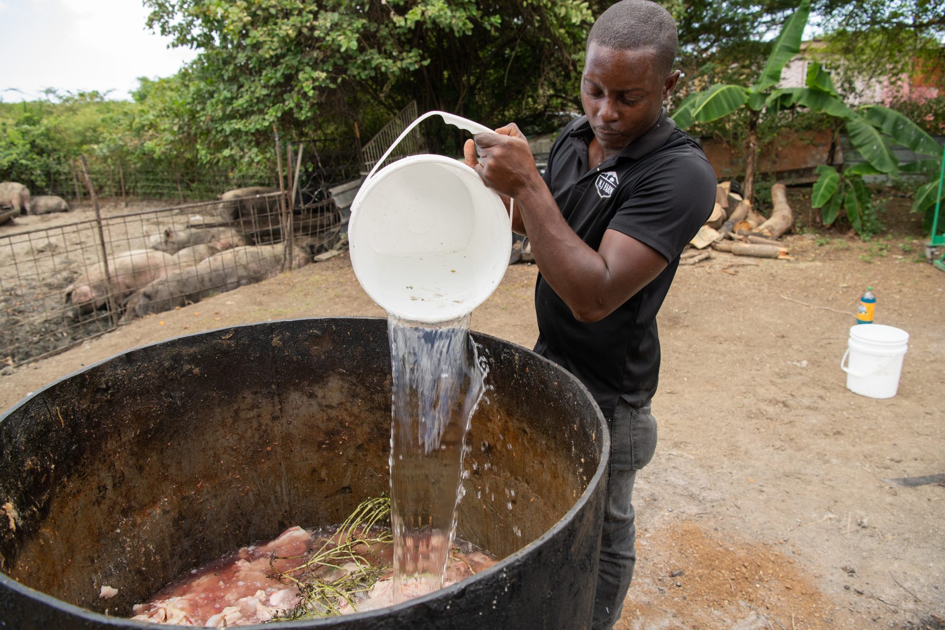 Spesial pa e finka di porko tin diferente hotel i restorant ta kolektá e sobránan di kuminda den barí. Den su pikòp Avienne ta transportá e karga balioso akí di Bándariba pa Bándabou. Na su finka e ta saka tur loke no ta komibel afó. Loke sobra e ta meskla den un mikser den e kuminda nutritivo ku el a prepará promé. E bestianan ta kome masha dushi mes!
